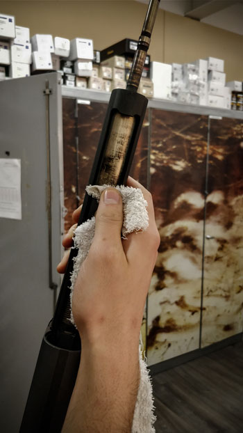 kaasumäntätoimisen aseen kaasumäntä ja makasiiniputken ulkopuoli ovat usein todella likaisia. ruutikarstaan kannattaa suihkuttaa reilusti aseöljyä, ja antaa sen vaikuttaa 15-30 minuuttia. Tämän jälkeen osia voi alkaa putsaamaan esimerkiksi talouspaperilla (voit käyttää myös kangasriepua, mutta riepu on usein käyttökelvottoman likainen jo muutaman pyyhkäisyn jälkeen). Kun olet pyyhkinyt pois suurimmat karstat, jäljellä on usein putkeen kiinnipalanut osa, joka ei niin vain irtoakaan. Tähän hyviä työkaluja ovat pronssiharja tai tuppo öljyistä teräsvillaa.