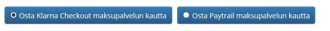 Voit maksaa ostoksesi joko Klarna Checkout tai Paytrail maksupalvelun kautta. Valinta on tehtävissä ostoskorissa: