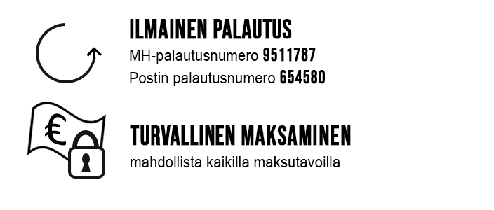 Tuotteilla on 30 päivän ilmainen vaihto- ja palautusoikeus. Palautettavan tuotteen tulee olla käyttämätön ja myyntikuntoisessa pakkauksessa. Palautuksen mukaan tulee pakata palautuslomake (voit tulostaa sen täältä) tai saateviesti, josta selviää tilaajan tunnistetiedot sekä palautuksen/vaihdon syy. Tuotevaihdoissa on viisasta olla yhteydessä myös myymäläämme niin voimme varata oikean tuotteen syrjään.