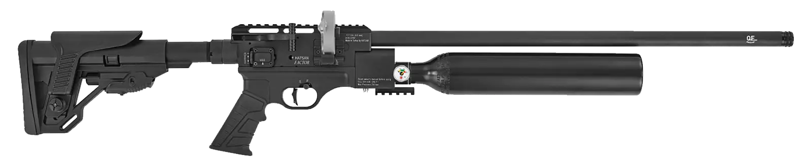 Ladataan tiedostolistaa...Hatsan Factor on tehokas AR-15 mallinen PCP -paineilmakivääri, joka soveltuu mainiosti tarkkuusammuntaan ja toiminnaliseen harjoitteluun. Siinä on teleperäputki, sekä pistoolikahva, jotka ovat yhteensopivia AR-15 osien kanssa. Tähtäimen kiinnitämistä varten päällä on 20 mm Picatinny -kisko, sekä etujalkoja tai -kahvoja varten on liipasinkaaren etupuolella oma kiinnityspaikka. Kiväärin tehoa säädetään kiväärin vasemmalla puolella sijaitsevalla valintapyörällä. Valittavana on kolme eri tehoaluetta, 18-23 joulea, 30-42 joulea ja 38-57 joulea. Hatsan Factor käyttää 19 luodin rullalipasta ja ase ladataan oikealla puolella olevasta latauskammesta. Aseen tarkkuden takaa lähes 60cm pitkä rihlattu Quiet Energy -piippu, jossa on 1/2 UNF -kierre äänenvaimenninta varten. Liipasin on Hatsanin oma Quatro Trigger eli kaksivaiheinen liipaisin.