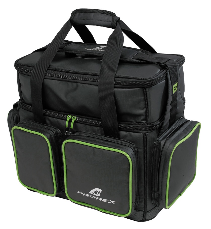 Daiwa Prorex Lure Bag 3 kalastuslaukku on tyylikäs ja tilava laukku vieherasioille ja tarvikkeille. Mukana 1kpl syvää rasiaa (rasioiden mitat 36 x 22,5 x 8,5cm) sekä 2kpl matalaa rasiaa(mitat:36 x 22,5 x 5,5cm). Edessä kaksi taskua, sekä sivuilla kaksi taskua johon saat mahtumaan työkalut ja tarvikkeet. Päällä iso tasku jossa irroittettavat tilanjakajat. Pohjassa kumipäällyste jotta vesi ei pääse pohjankautta sisään laukkuun.