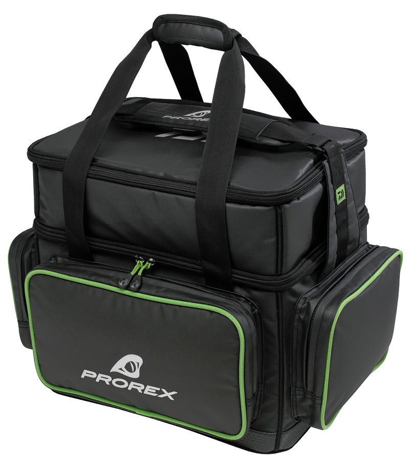 Daiwa Prorex Lure Bag 4 kalastuslaukku on tyylikäs ja tilava laukku vieherasioille ja tarvikkeille. Mukana 3kpl syvää rasiaa (rasioiden mitat 36 x 22,5 x 8,5cm). Edessä iso tasku, sekä sivuilla kaksi taskua johon saat mahtumaan työkalut ja tarvikkeet. Päällä iso tasku jossa irroittettavat tilanjakajat. Pohjassa kumipäällyste jotta vesi ei pääse pohjankautta sisään laukkuun.