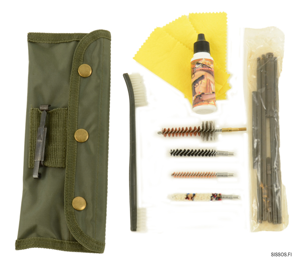 .223 Kiväärin puhdistussarja kangaspussissa sisältää puhdistusharjanvarren, 4 erilaista harjaa, puhdistuslappuja sekä 25 ml aseöljyä. Toimitetaan vihreässä pussissa.