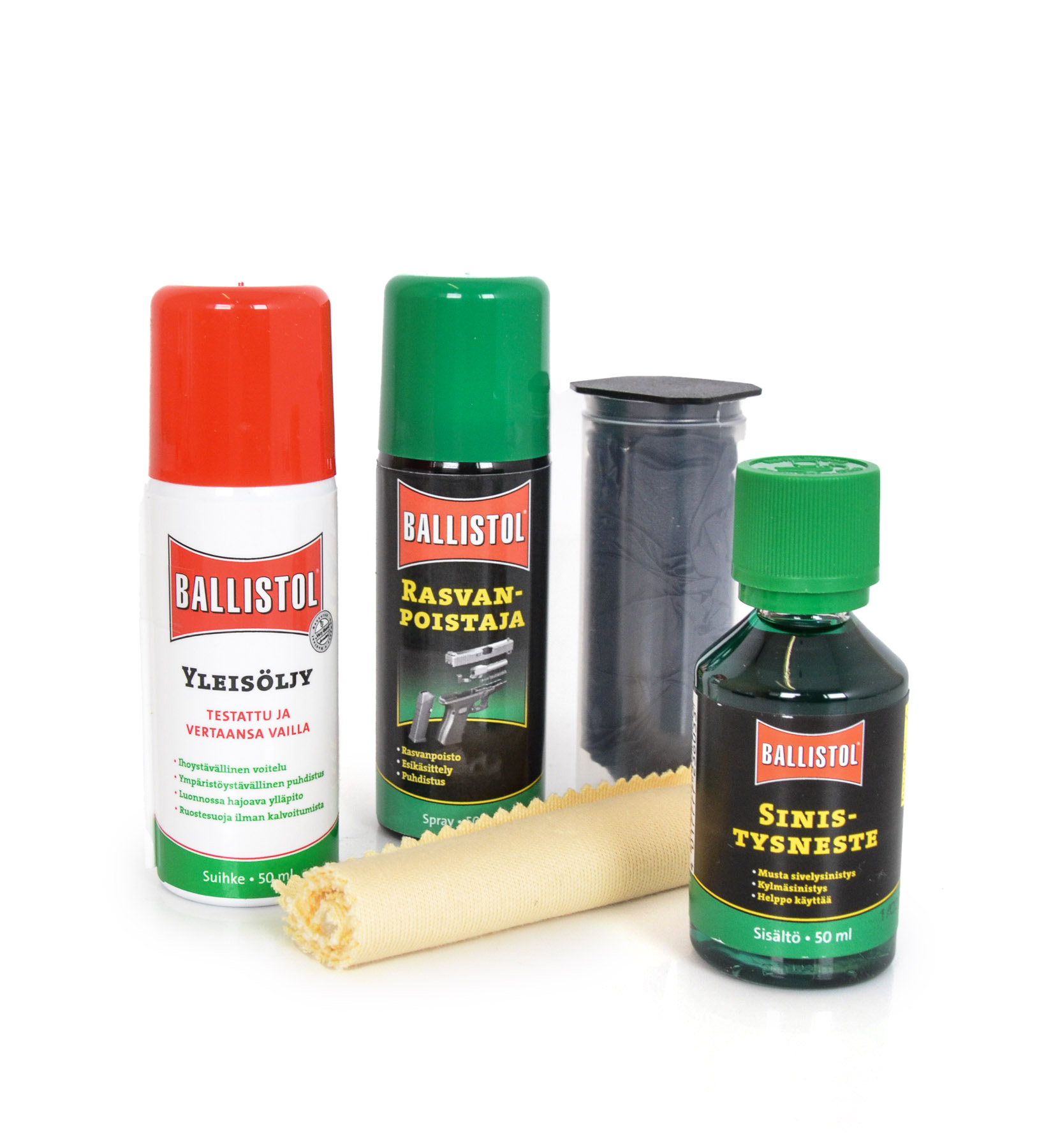 Sarja sisältää Ballistol 50ml yleisöljyn, rasvanpoistajan ja sinistysnesteen sekä käsineet, kaksi nukatonta hoitoliinaa ja sivellintä.