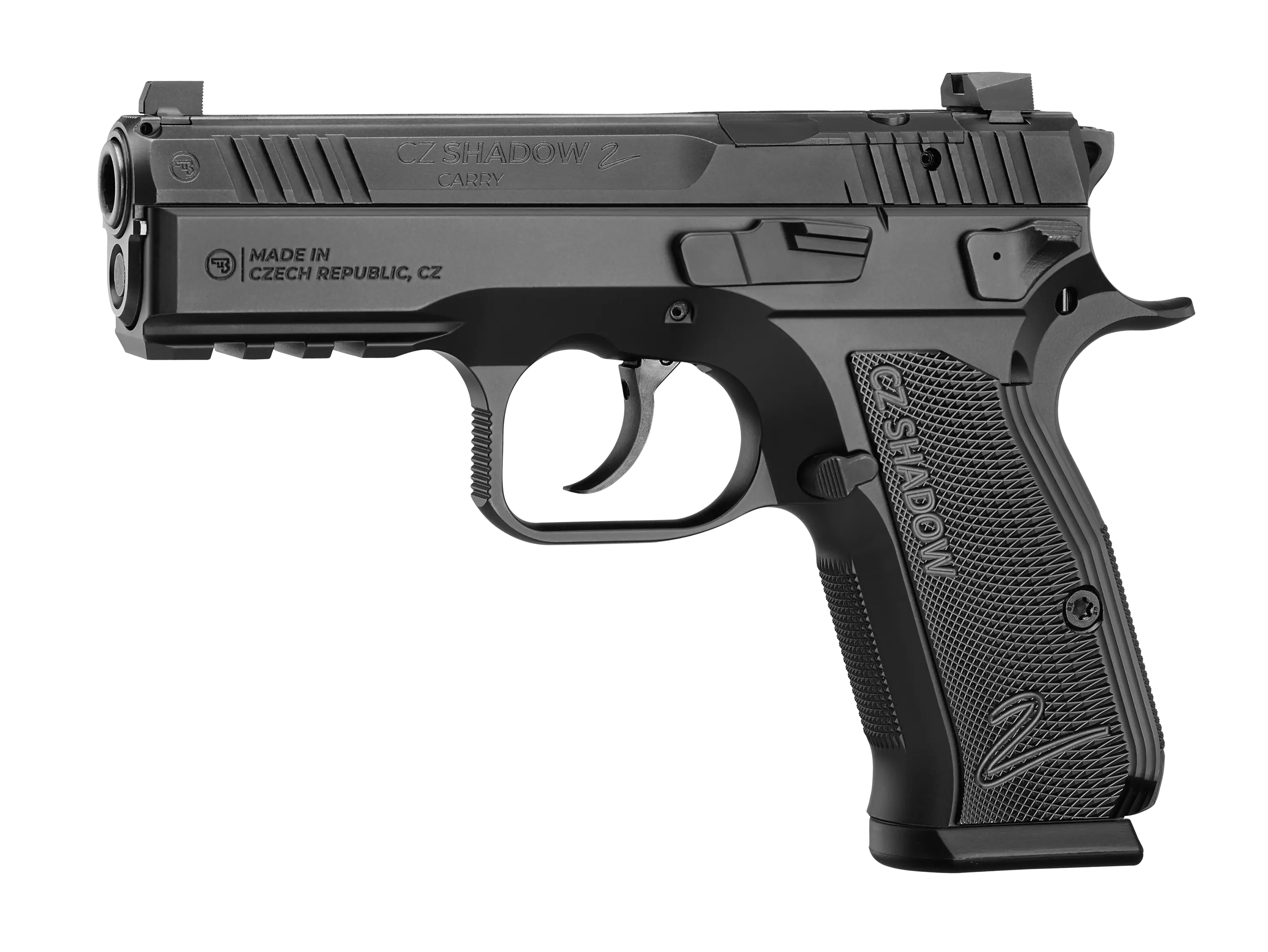 CZ Shadow 2 Carry on kompakti versio suositusta CZ Shadow 2 -pistoolista. Se yhdistää Shadow 2 -sarjan tarkkuuden ja ergonomian pienempään ja kevyempään runkoon, mikä tekee siitä ihanteellisen valinnan niille, jotka haluavat suorituskykyisen aseen päivittäiseen käyttöön. Carry malli toimitetaan vireenpoistajalla varmistimen sijasta.