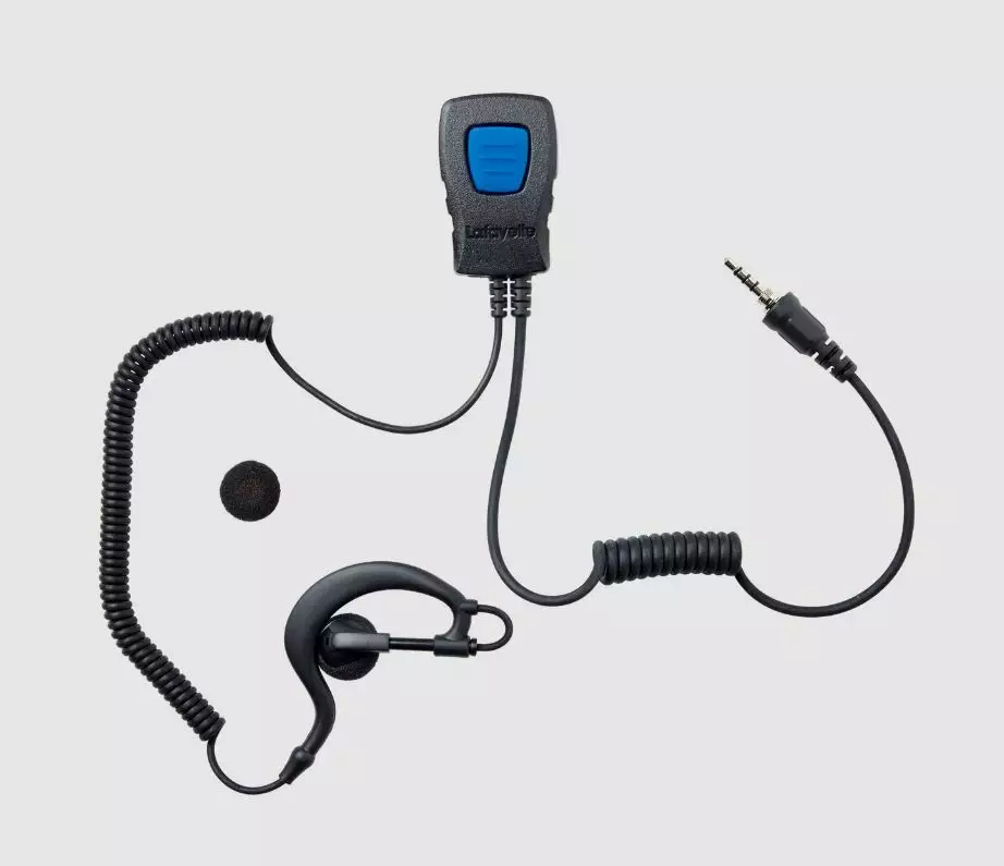 Lafayeten valmistama Miniheadset nappikuulokkeella. Puhepainikkeessa on metallinen klipsi.
