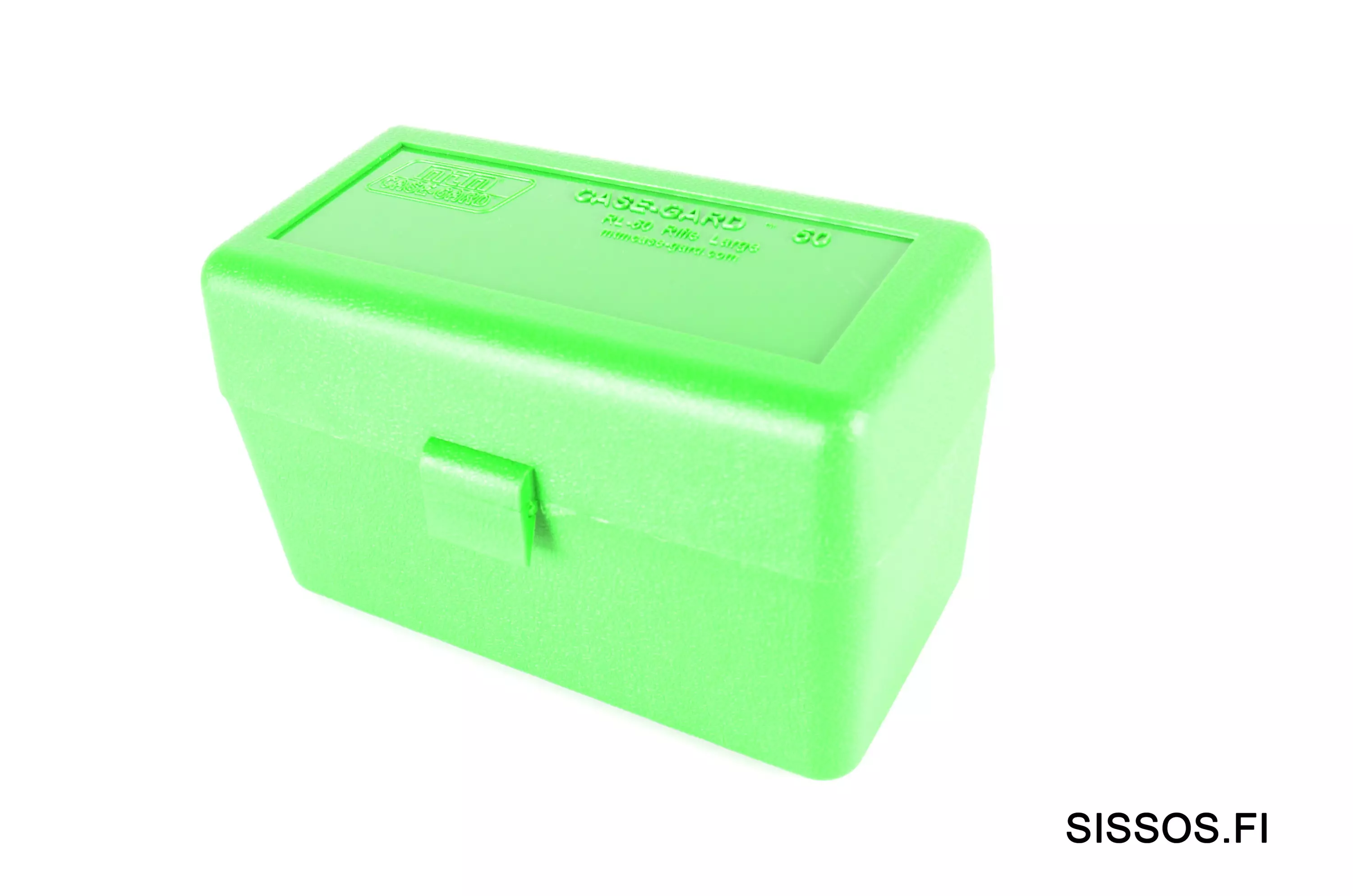MTM RL-50 patruunalaatikko kiväärikaliipereille on valmistettu lähes tuhoutumattomasta polypropeenista, joka ei väänny, halkeile, kuoriudu, laajennu tai kutistu. Patruunat ovat helposti otettavissa rasiasta ja rasiat ovat pinottavia. Rasioissa on täyspitkä mekaaninen sarana, jolla valmistajan 25 vuoden takuu. Snap-Lock salpa pitää rasian hyvin kiinni.