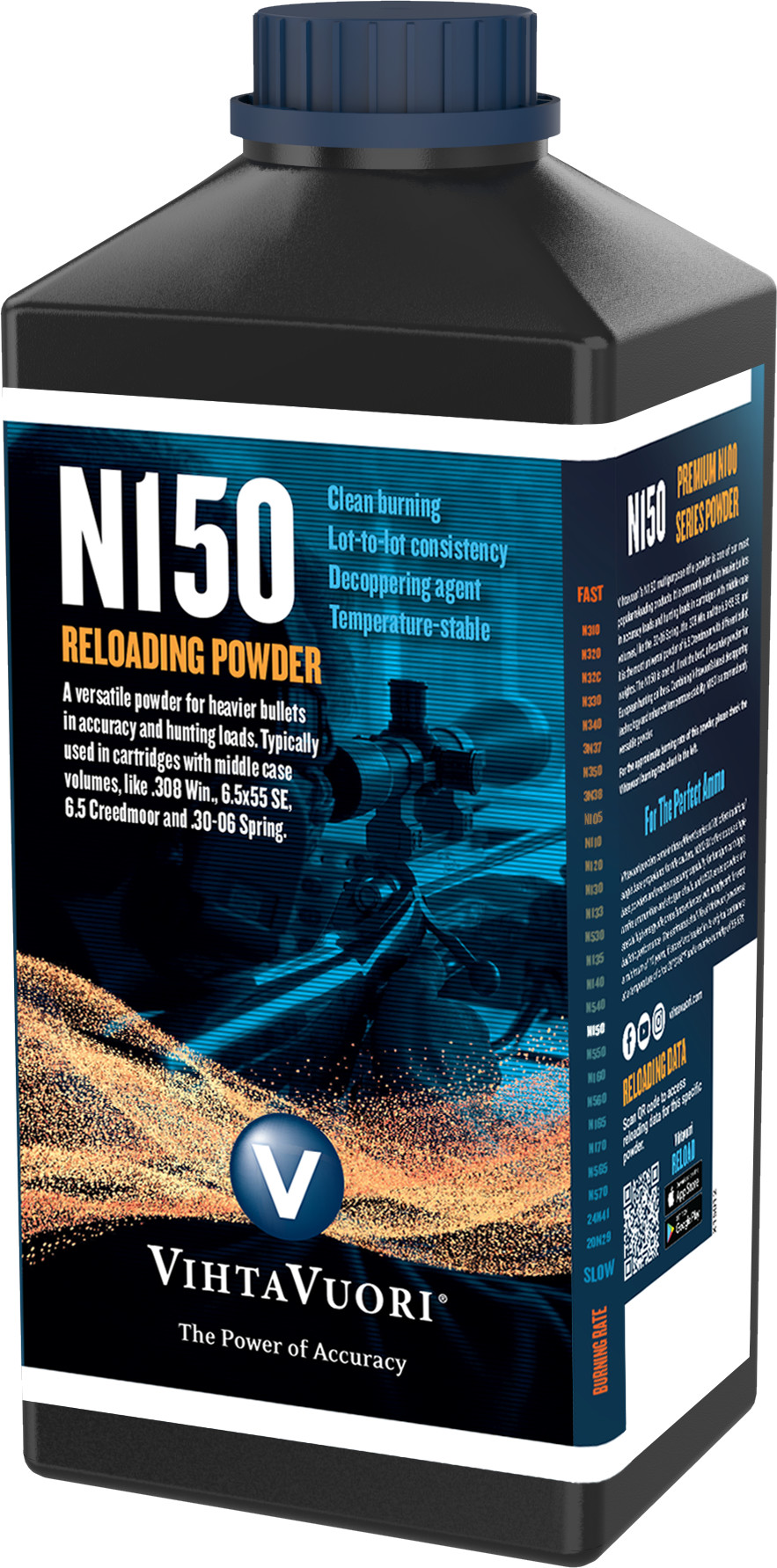 N150 on oikea ruuti mm. .30 -kaliiperin raskasluotisiin tarkkuus- ja suurriistapatruunoihin. Pitkän matkan kasa-ampujien suosikki!