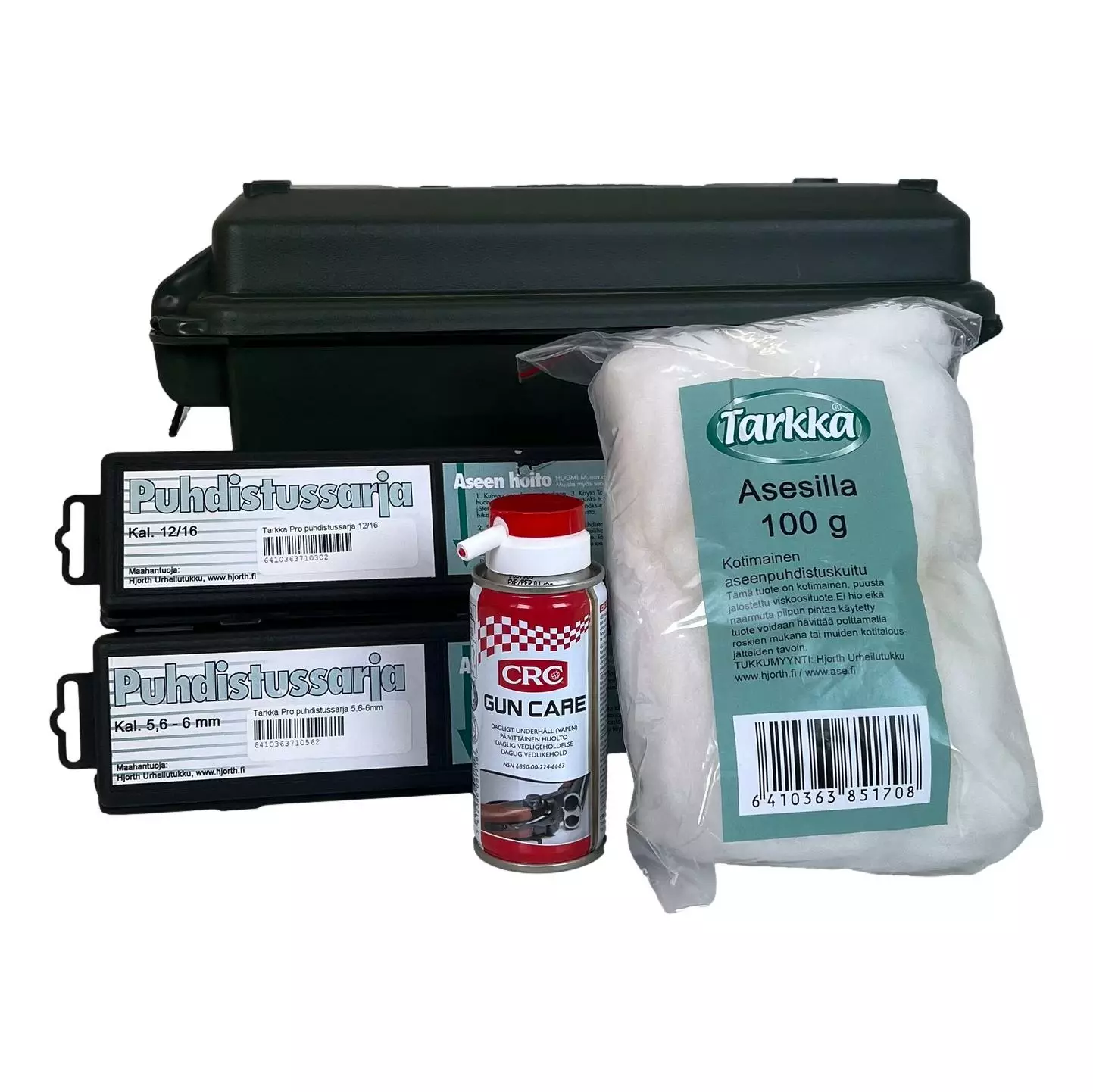 Setti sisältää kaiken tarvittavan aseen perushuoltoon ja putsaukseen - vieläpä pakattuna tyylikkääseen Hjort patruunalaatikkoon.