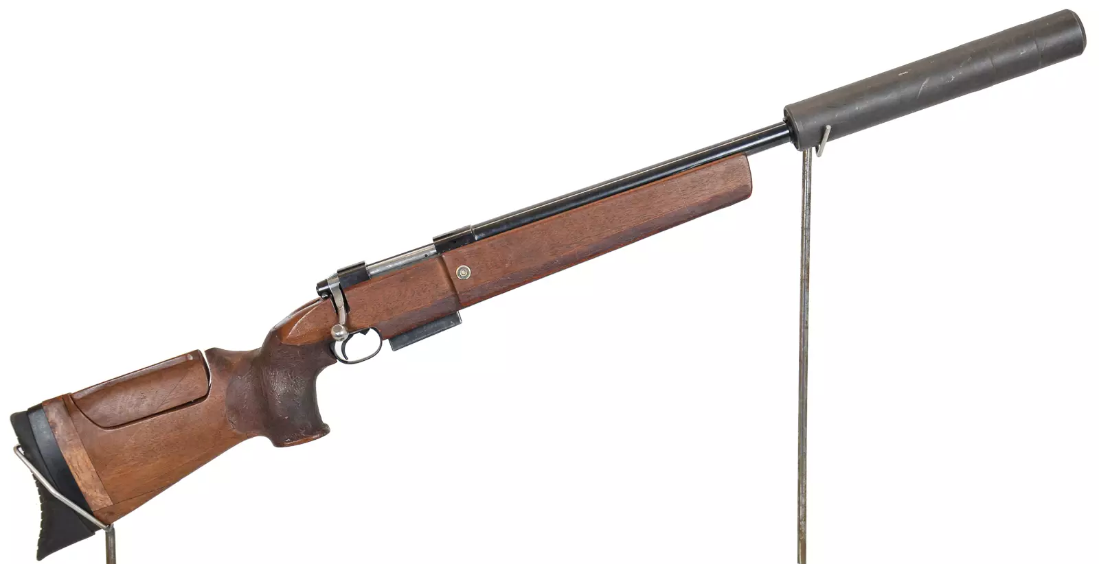 Sporter-tukkinen ase. Tukki näyttää omavalmisteiselta. Ase myydään piiputettavaksi. Alkuperäinen piippu on erittäin huonossa kunnossa