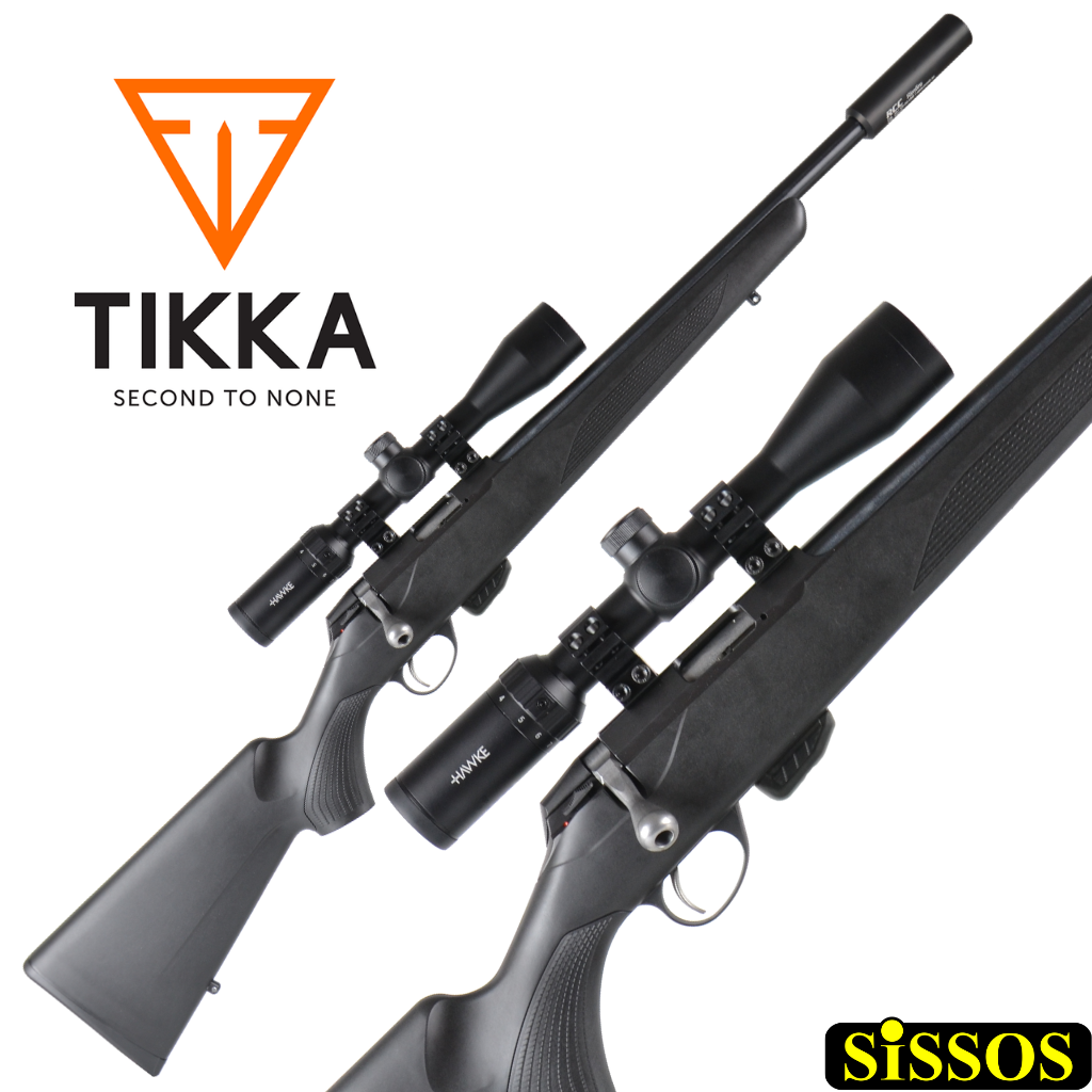 Tikka T1x paketti sisältää itse pienoiskiväärin, Hawke Vantage 3-9x40 kiikaritähtäimen MilDot ristikolla, UTG alumiinijalat sekä kompaktin RCC äänenvaimentajan. Huom! Kuvasta poiketen ase toimitetaan UTG kiikarinjaloilla.
