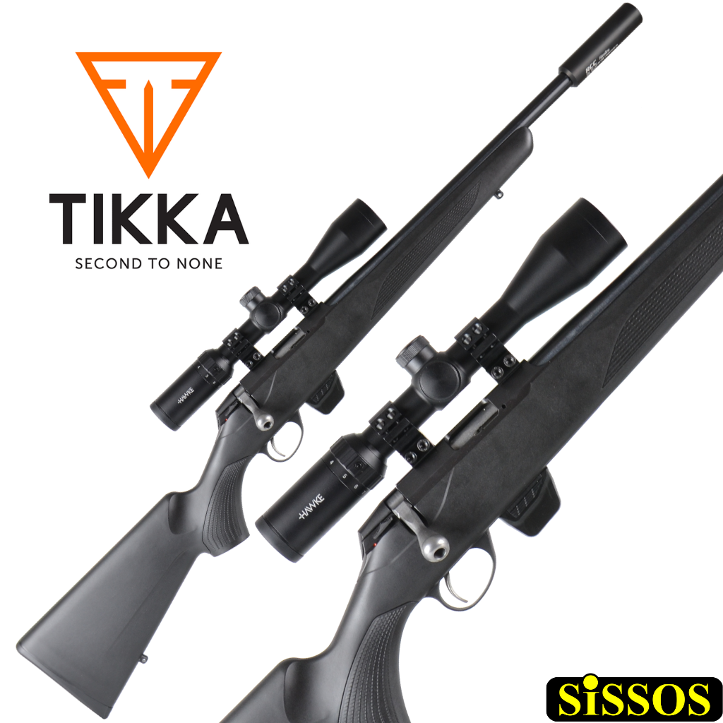 Tikka T1x paketti sisältää itse pienoiskiväärin, Hawke Vantage 3-9x40 kiikaritähtäimen MilDot ristikolla, UTG alumiinijalat sekä kompaktin RCC äänenvaimentajan. Huom! Kuvan aseessa eri kiikarinjalat.