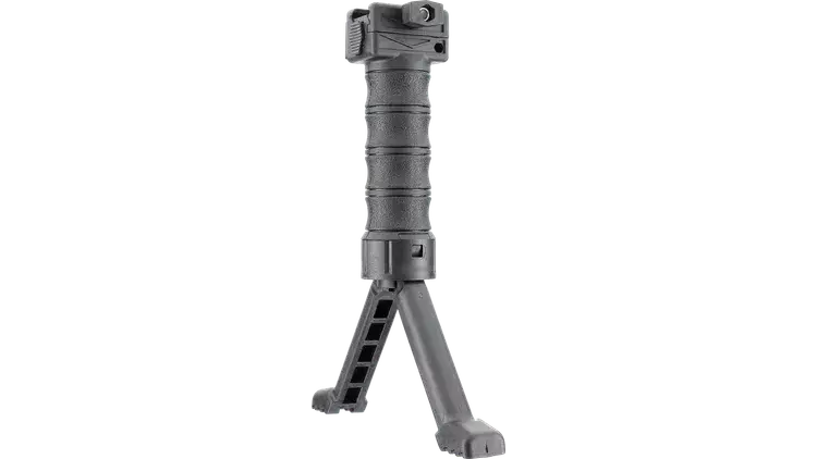 Kestävästä Polymeeristä valmistettu etukahvan ja bipodin yhdistelmä Picatinny-kiskoon. Bipodi avautuu jousivoimalla nappia painamalla.