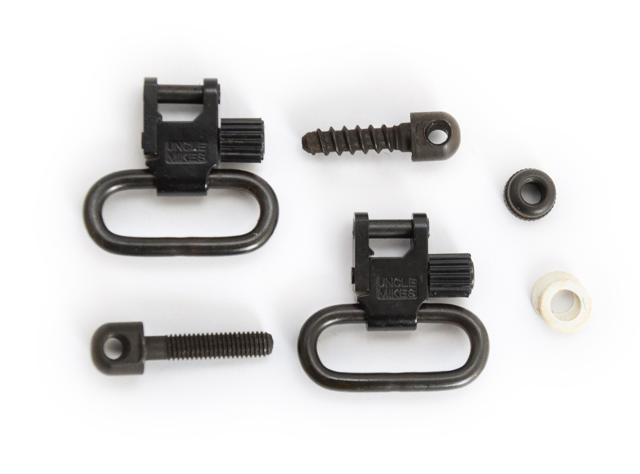 Uncle Mike's QD 115 -hihnalenkkisarja kivääreihin tai haulikoihin. Takana puuruuvi ja edessä koneruuvi. Tässä setissä tulevalla koneruuvikierteellä olevalla hihnalenkillä saadaan muokattua Sako 90 Finnlight kivääriin kiinnitys bipodille.