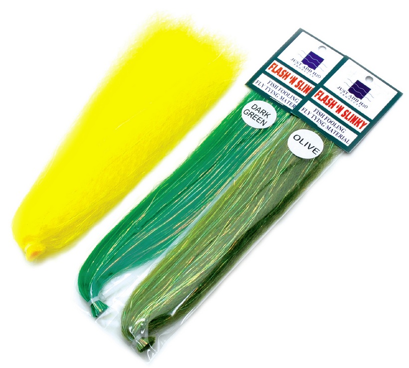 Flash'n Slinky on erittäin monikäyttöistä ja näyttävää materiaalia, jolla saa tehtyä esimerkiksi siiven tai pyrstön. Kuitunipun keskellä menee kimallekuituja siellä täällä, joten tähän materiaaliin ei välttämättä tarvitse erikseen lisätä kimalletta. Soveltuu esimerkiksi haukiperhoihin tai streamereihin.