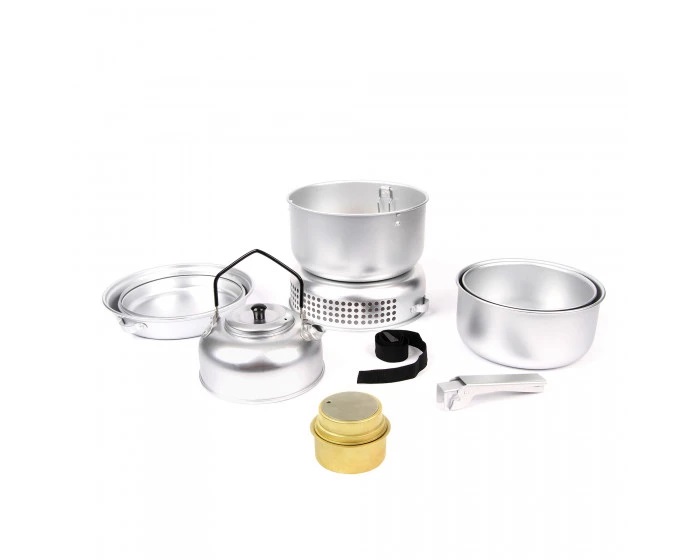 - Pakkaus sisältää: sprii keittimen, keittimen rungon, tuulisuojan, 2x kattila, 2x paistinpannun/lautasen, kahvipannun ja pihdin