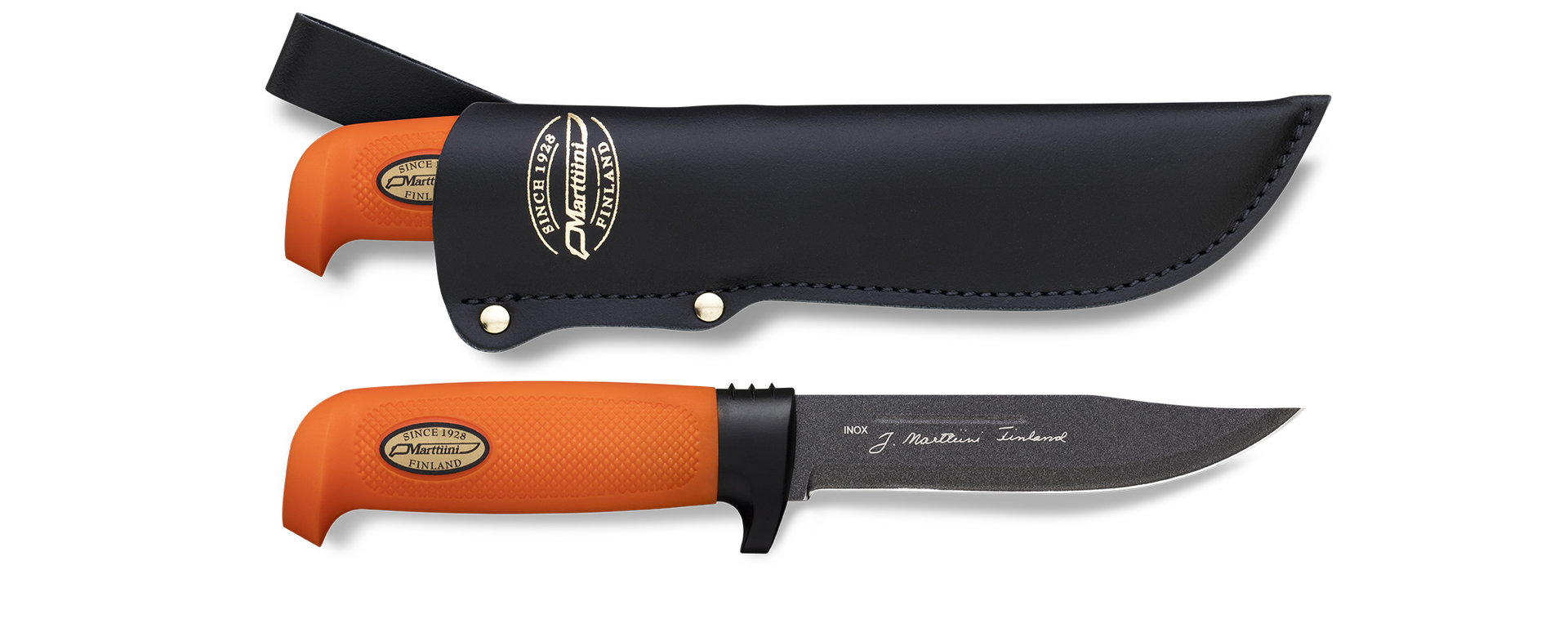 Marttiini Big Game - Martef-pinnoitteiset puukot ovat erinomaisia metsästäjän apuvälineitä. Likaa ja kosteutta hylkivä Martef-pinnoite pienentää kitkan lähes olemattomiin ja samalla suojaa terää korroosiolta. Pinnoitteen ansiosta terä liikkuu erittäin sujuvasti leikattavassa materiaalissa ja terän puhdistaminen käytön jälkeen on erittäin helppoa. Big Game Martef on näyttävä puukko suurriistan käsittelyyn. Puukossa on normaalia kookkaampi oranssi kahva, joten se istuu isompaankin käteen kuin valettu. Ergonomisesti muotoiltu kumikahva on helppohoitoinen, hygieeninen ja turvallinen. Se tuntuu miellyttävän lämpimältä kädessä myös eräolosuhteissa, kuten kovalla pakkasella tai märkänä. Tässäkin puukossa on turvallinen karhennettu kumikahva sekä sormisuojahela.