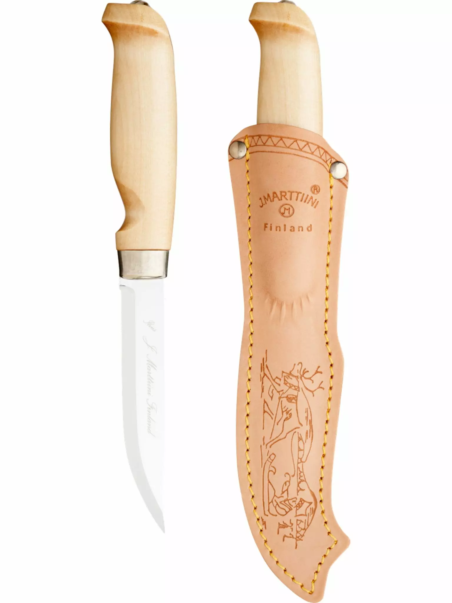 Marttiini Ilves 129, Blister on erinomainen yleispuukko, jonka legendaarisen terävän terän kärjessä on tunnusomainen pannukoukku. Ilves 129 on perinteinen, tehtaan perustaja Janne Marttiinin suunnittelema malli. Säilytä puukko terävänä ja puhtaana parhaan käyttökokemuksen takaamiseksi.