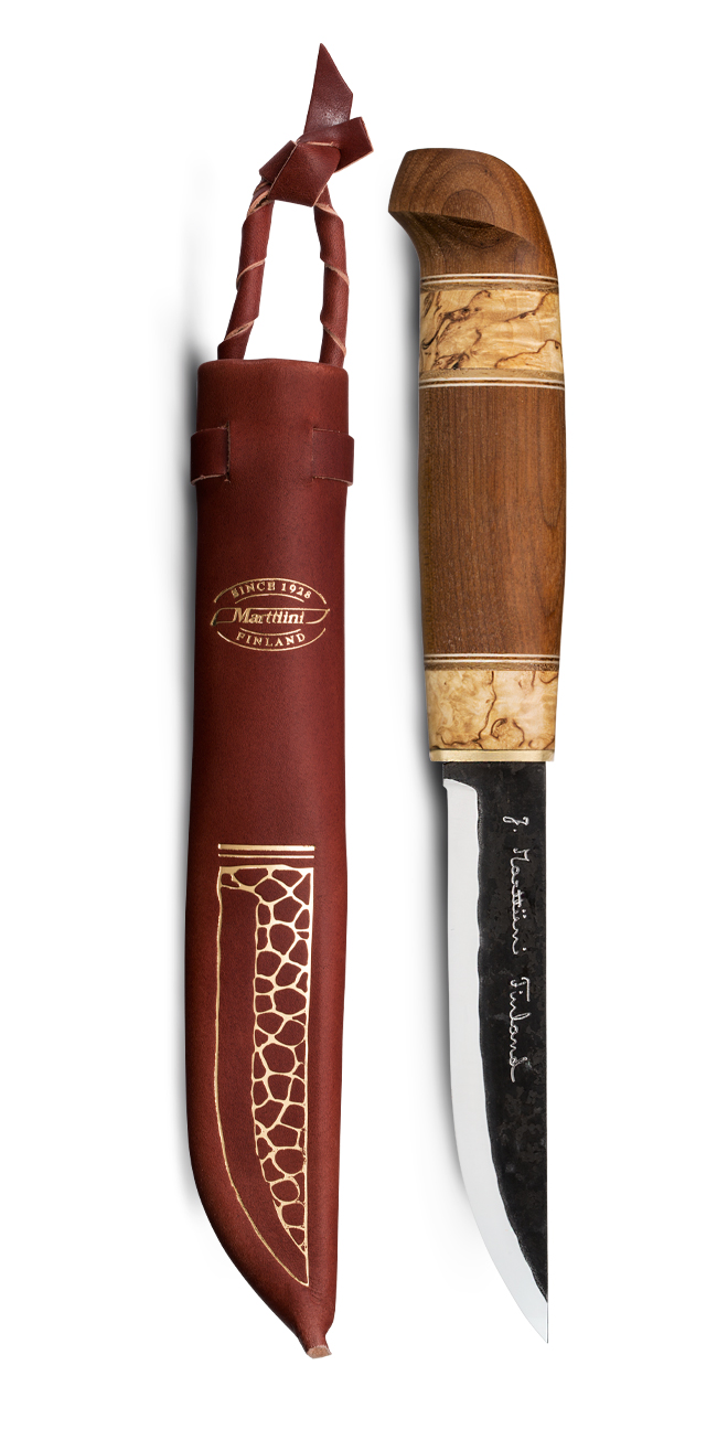 Marttiini Kierinki puukko on tehty kunnianosoituksena suomalaiselle puukolle ja Marttiinin puukkotehtaan perustajalle. Janne Marttiinin kotikylän nimeä kantava vuolupuukko on taottua hiiliterästä ja kahvassa vuorottelevat lämpökäsitelty koivu ja visakoivu. Tuppi aitoa nahkaa. Muistathan hoitaa hiiliteräspuukkoasi hyvin: kuivaa terä huolellisesti aina käytön jälkeen ja öljyä terää suolattomalla öljyllä säännöllisesti.